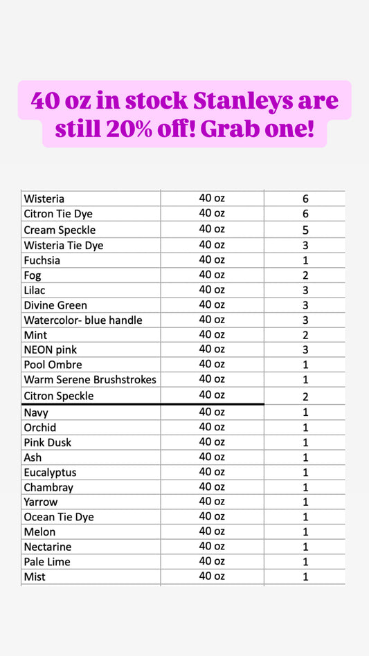 20% OFF IN STOCK COLORS 40oz Engraved Stanley Cup TumblersRegular price $55.00 USDRegular priceUnit price / per$68.00 USDSale price $55.00 USDSale